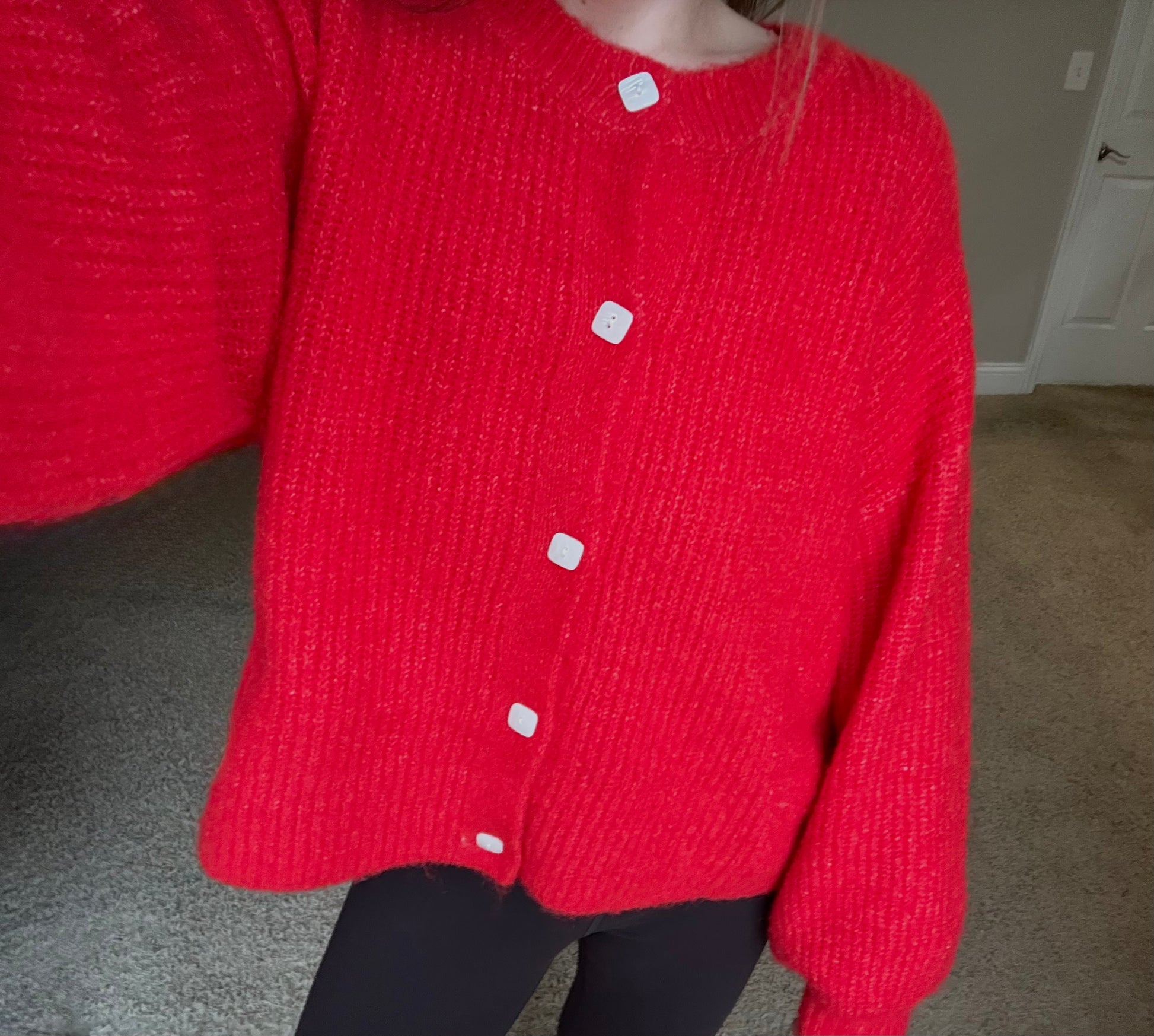 balloon sleeve cardigan, chunky knit, oversized fit, cropped cardigan, ribbed knit, button up sweater, fall fashion, winter layers, cozy cardigan